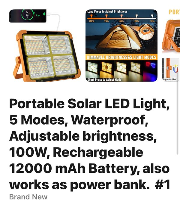 Waterproof, adjustable. Rechargeable, also works as a power bank. 12000mAh.