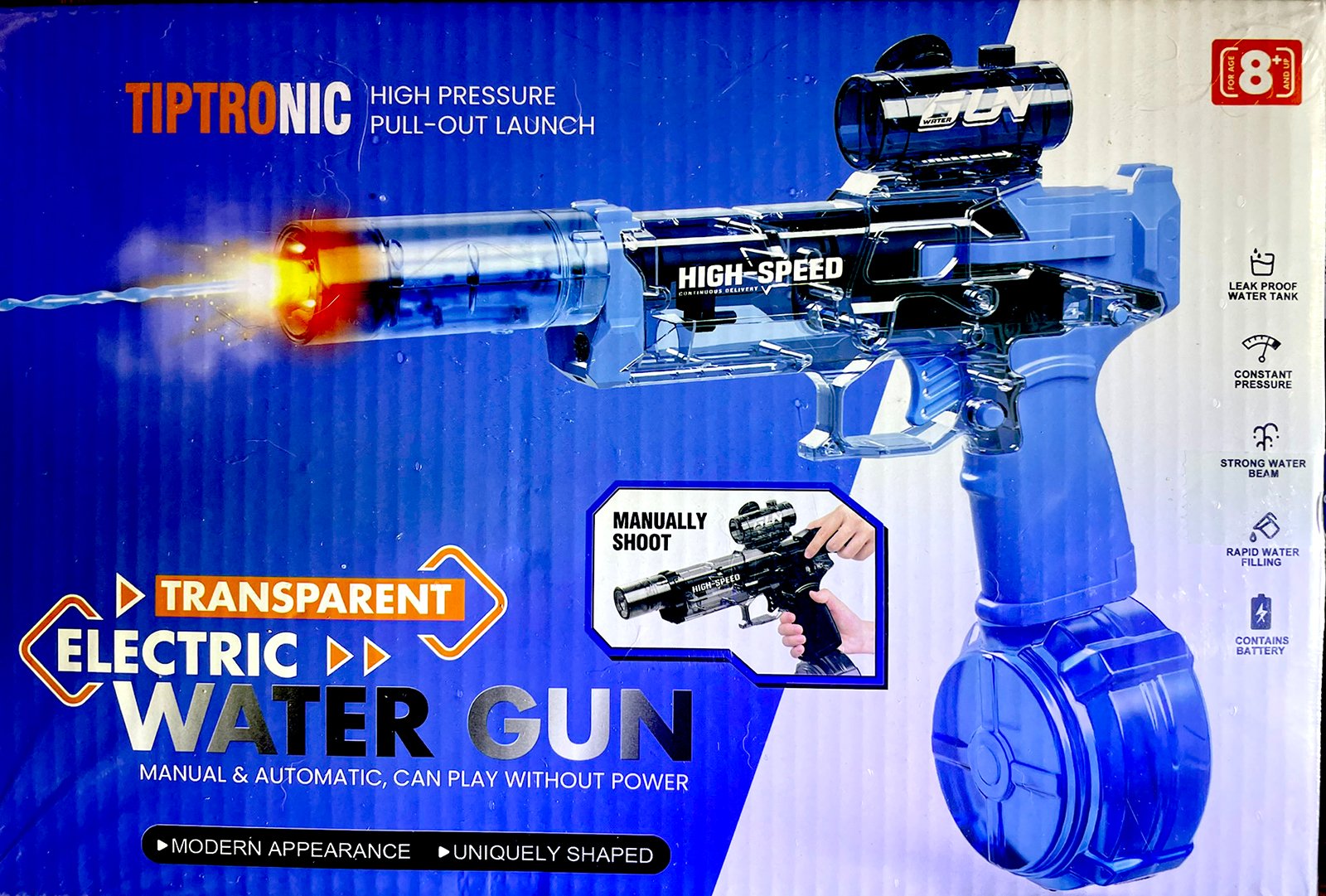 Transparent Electric water gun. Rechargeable. Tons of fun.